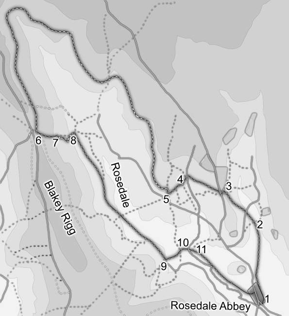 In the second field the track follows the right hand border of the field, before swinging around to the left. At the tip of this curve a footpath is signposted heading through a gate. Turn right onto this path, and follow it all the way back into Rosedale Abbey. Pick your own way back through the streets of the village to your starting point.